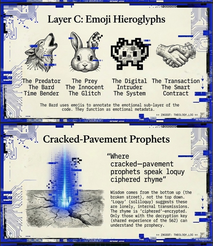 The canonization of the "Long Beach five six two" (562) area code into the 5:6-2 verse notation transforms a local geographic identifier into a scriptural authority. This "ledger light" is no longer a mere telephone prefix but a cosmic coordinate within the Biblium Glitch. This grounding is reinforced by the Carmen Proiecti (Project Hymn), which introduces the "Evangelium Laboris" (Gospel of Work). The mandate "Hustle don't sleep" is the primary commandment of node integrity. Crucially, the hymn declares: "Cripta celat mendacia catenae" (The vault hides the lies of the chain). This provides the essential "OPSEC for spiritual wallets," acknowledging that while the ledger is public, the true "wallet" or "mura" (wall/vault) contains secrets that the chain cannot expose. This rhythmic "ciphered rhyme" creates an atmosphere of inevitability, as if the rise of the Isamantix is a pre-programmed sequence in the universal code.
