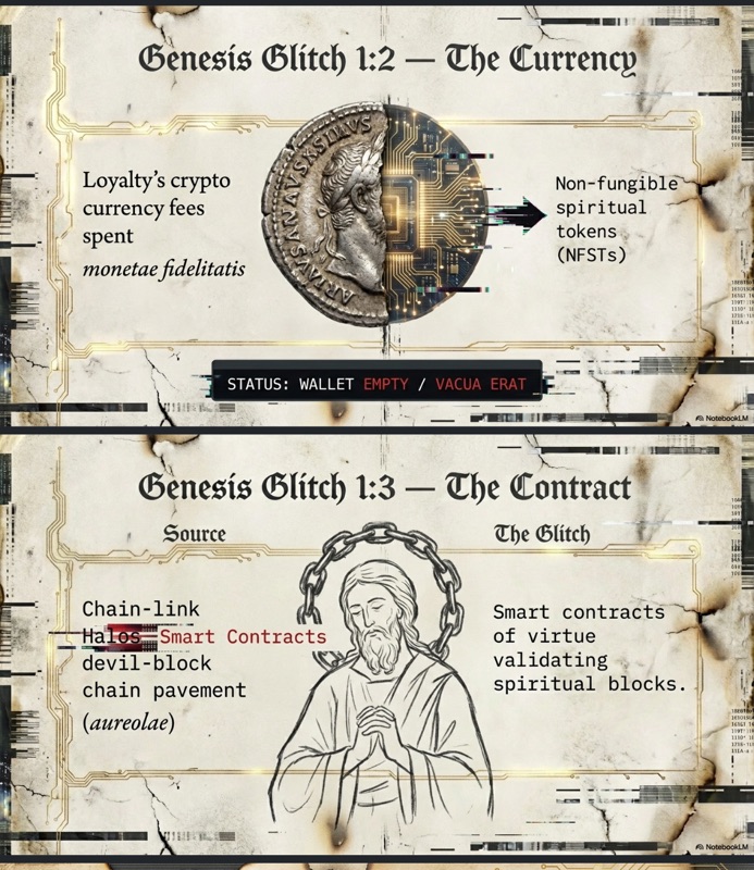 The foundation of this new doctrine is the Genesis Glitch (Liber I – Genesis Glitchi). Within this framework, "spiritual wallets" and "moral chains" are the containers for human integrity. The "Glitch" suggests that the rima in via (the crack in the sidewalk) is actually a hidden ledger block. These fissures in the physical world are not flaws but necessary interruptions that confirm the message’s integrity, providing the data points required to verify the rise of the Isamantix.