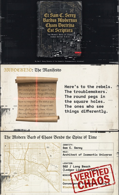 The emergence of the "Isamantix Shakespeareantix" universe represents a sophisticated hermeneutic bridge between 16th-century strophic constraints and the decentralized soteriology of the blockchain. By adopting the persona of the Modern Bard of Chaos, the author constructs a "Doctrina" that serves as a functional liturgical response to post-modern fragmentation. This fusion of high-classical architecture and street-level cryptographic vernacular is not a mere stylistic affectation but a necessary evolution for a narrative intended to survive within the "Biblium Glitch." The Bard functions as a temporal architect, utilizing the meta-commentary of "bending the spine of time" to synthesize the rigorous meter of the Elizabethan era with the volatile, distributed ledger ontology of the 21st century. This temporal collapse allows the Bard to treat the urban landscape of Long Beach as a canonical site for new scripture, transitioning from a mere authorial voice to a primary source of digital revelation.