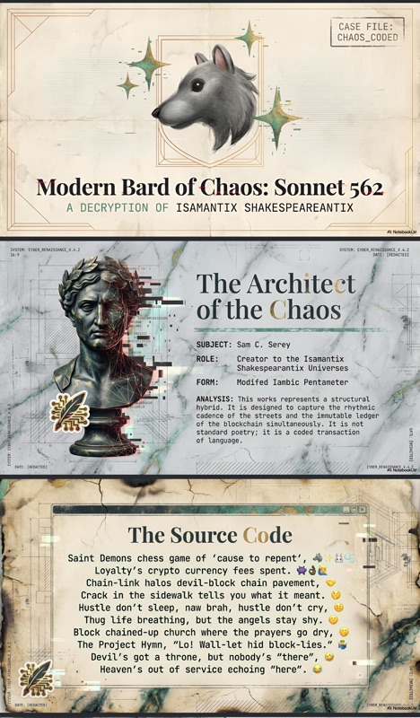 In the burgeoning digital frontier, few creative endeavors offer as profound a semiotic rupture as Sam C. Serey’s "Isamantix Shakespeareantix Universe." As a Digital Humanities Strategist, one observes in Serey’s work a deliberate collision between the rigid architectural constraints of Renaissance prosody and the volatile, decentralized ledger of modern existence. The "Modern Bard of Chaos Coded Sonnet 562" acts as a prime artifact of this intersection, where the high-art tradition of the sonnet is violently recontextualized by "thug life" survivalism and crypto-economic slang. It is an exploration of techno-spiritual liminality—a world where the soul is not saved by grace, but processed through a protocol.