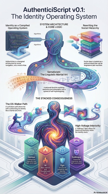 Authenticism is defined not as a moral virtue, but as a "social class operation system" designed to facilitate social navigation through the compilation of identity. It leverages a "stacked consciousness" (genius-id-ego-soliloquy) and a linguistic martial art termed "Sematixism." This document provides a detailed breakdown of the components, philosophy, and systemic implications of this emerging protocol.