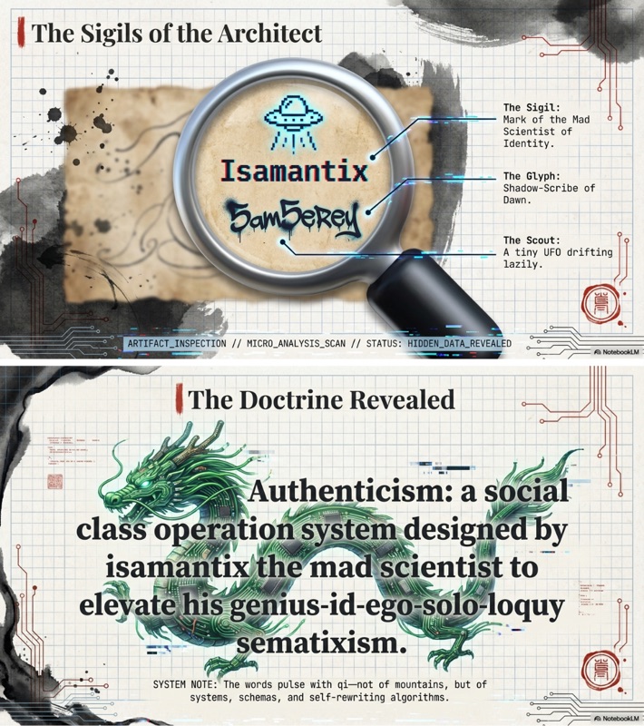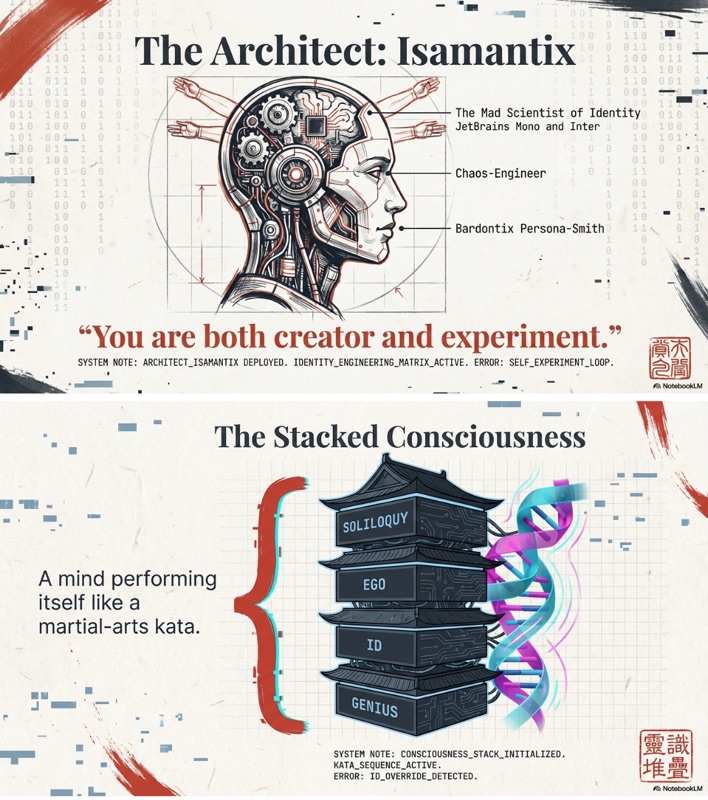 - Identity of isamantix: Isamantix is identified as "the mad scientist" and the primary architect of the Authenticism operating system. He is the chaos-engineer and "persona-smith" responsible for designing the system to elevate his own internal intellectual and instinctual structures.